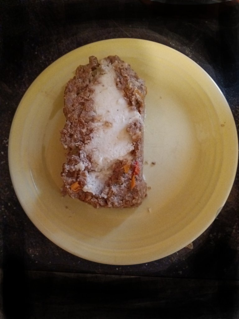 mashed potatoes in the center. Same result, the mashed potatoes just flowed out of the meatloaf when
