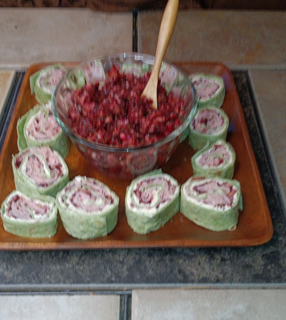 (the cheeses and deli meats have plenty), it’s really good with salty chips. I also like to serve a bowl of the remaining salsa with the roll up for those who want to up the cranberry factor.