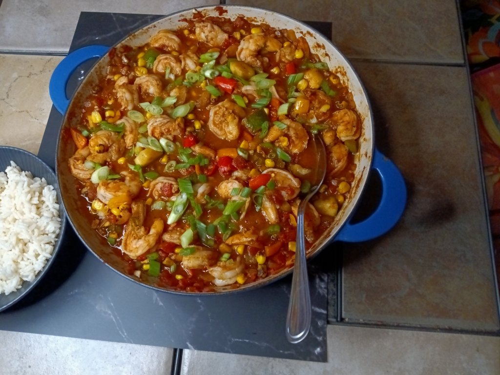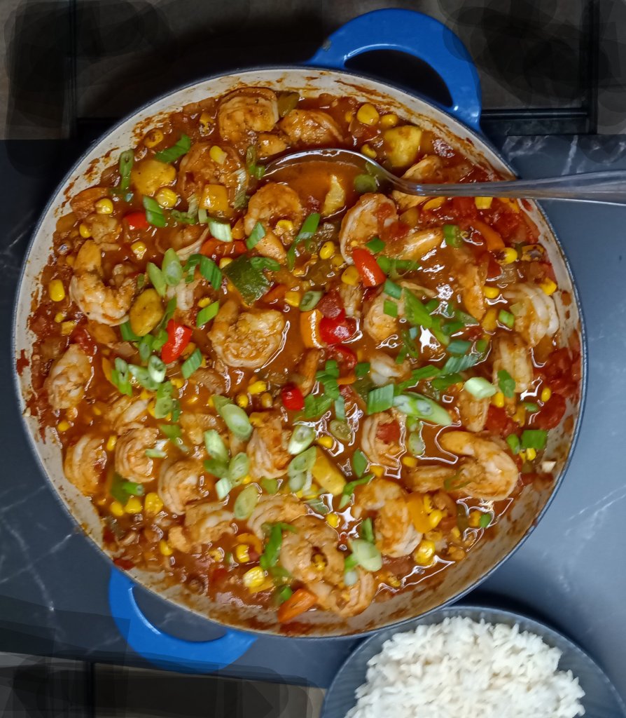 trinity of onion, bell pepper and celery. And shrimp, of course. This dish represents the creole aspect of