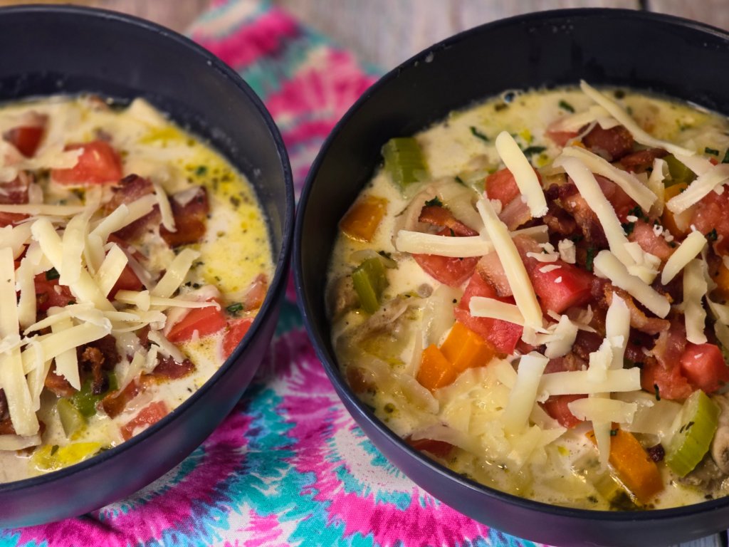 Move vegetables to sides of pan, creating a space in the center of the pan. Add the infused oil and cubed chicken, cook for 3-4 minutes, stirring occasionally. Add chicken broth and bring to a bare simmer and cook for approximately 5 minutes.
