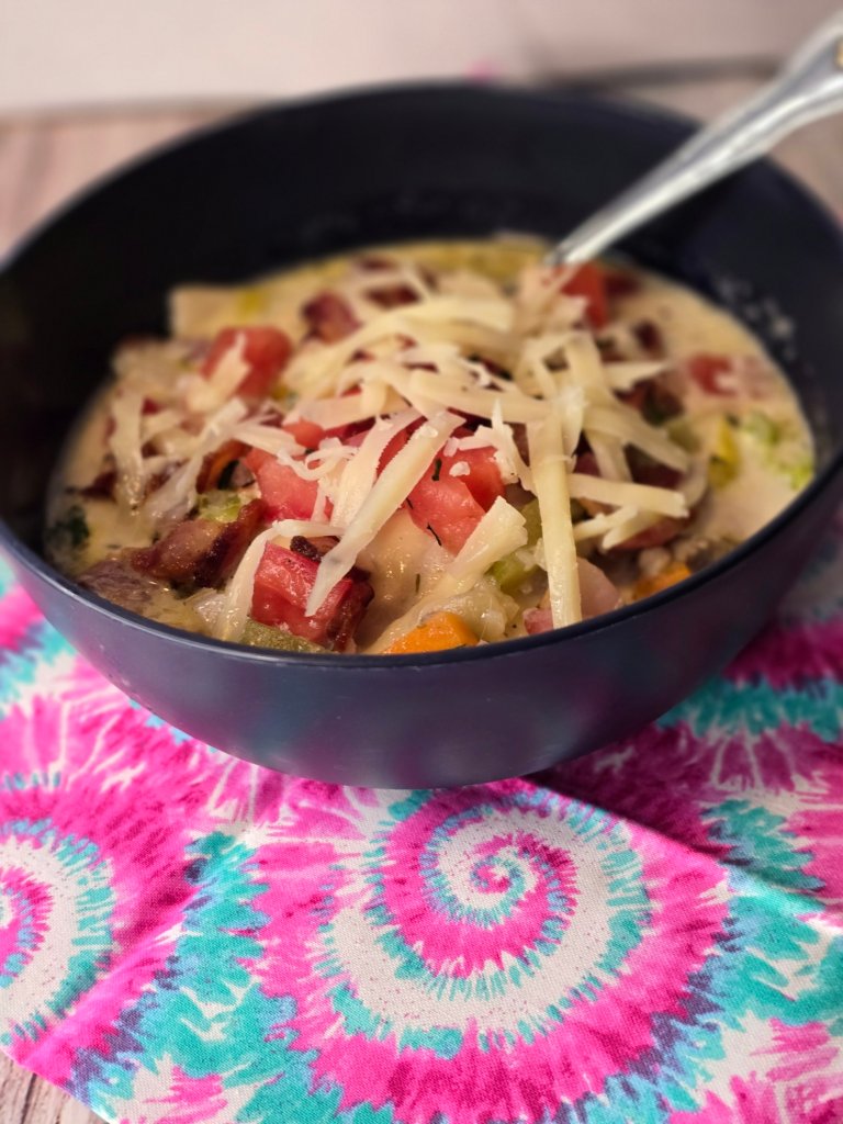 After the marathon of making the perogies, which was definitely a whole family project, we would gorge on mostly perogies, with a simple grilled protein. Until recently, I had never thought to do anything with the perogies other than eat them. I never considered them as an ingredient in a ‘bigger’ dish, such as this soup. If you haven’t spent half a day making the perogies themselves, you can unleash your creativity by using the (frozen) perogies in other dishes.