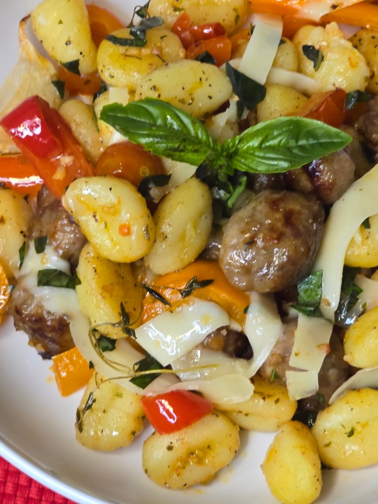 While sausage is cooking, add gnocchi to pan of barely simmering, salted water. Cook for 2 minutes, drain.
